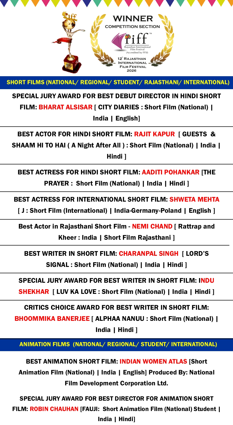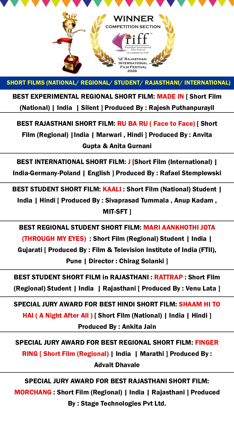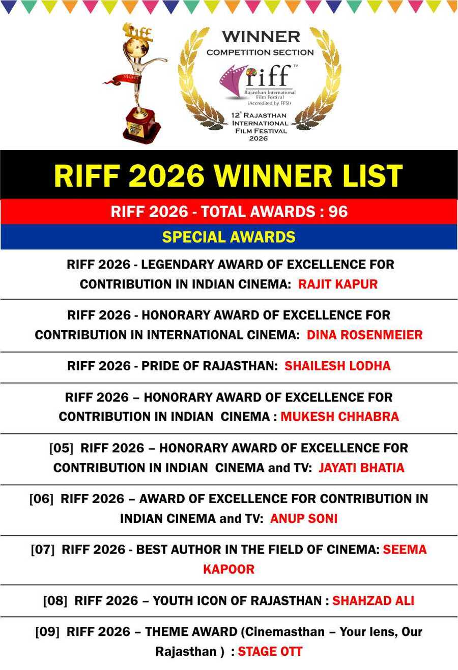 RIFF 2026 AWARD WINNER LIST on 4th FEB 2026