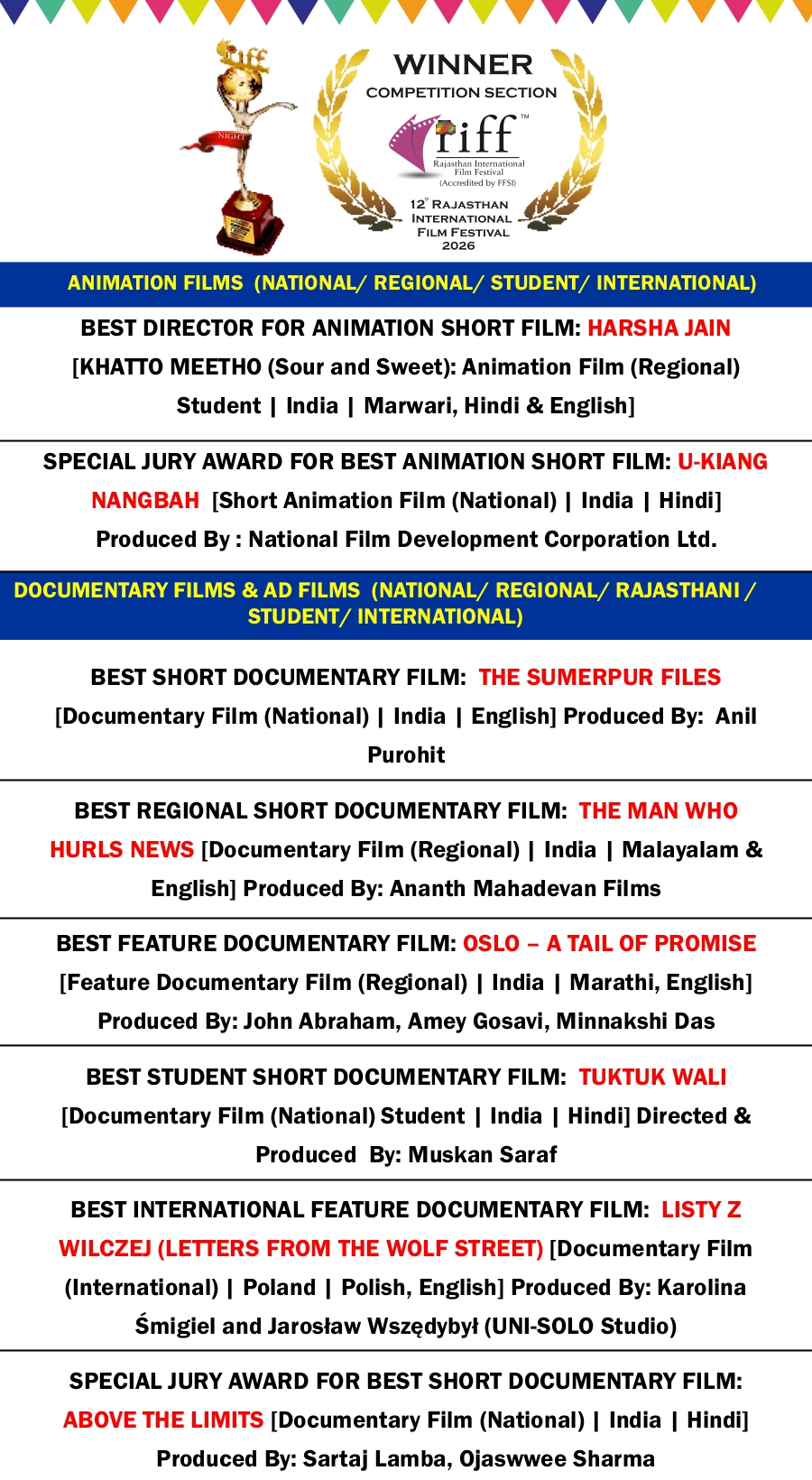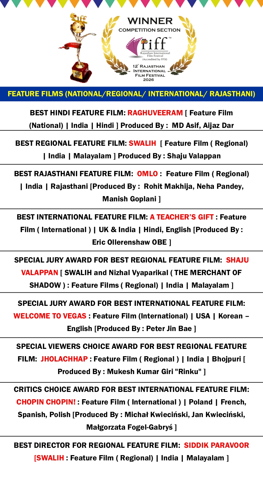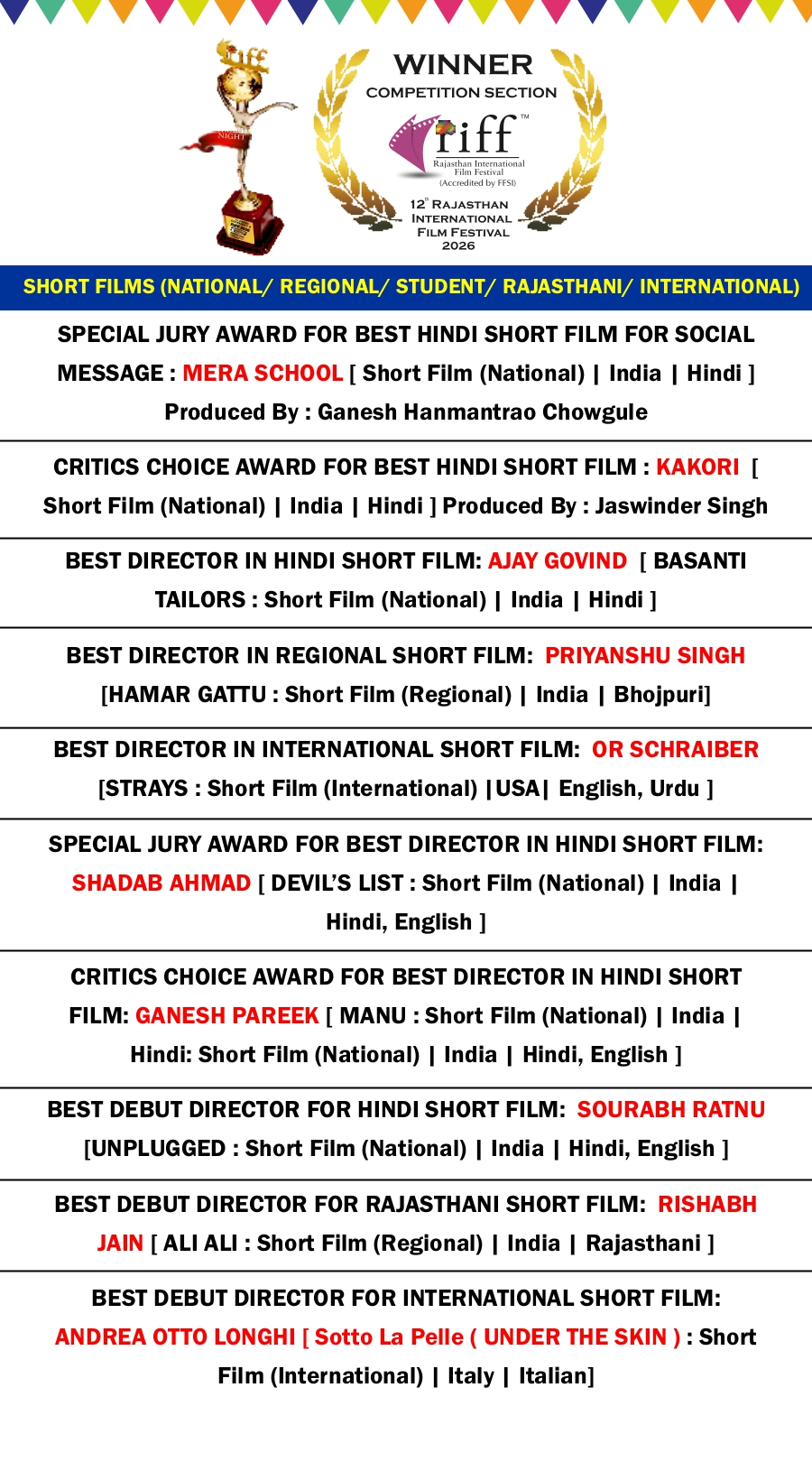 RIFF 2026 AWARD WINNER LIST on 4th FEB 2026