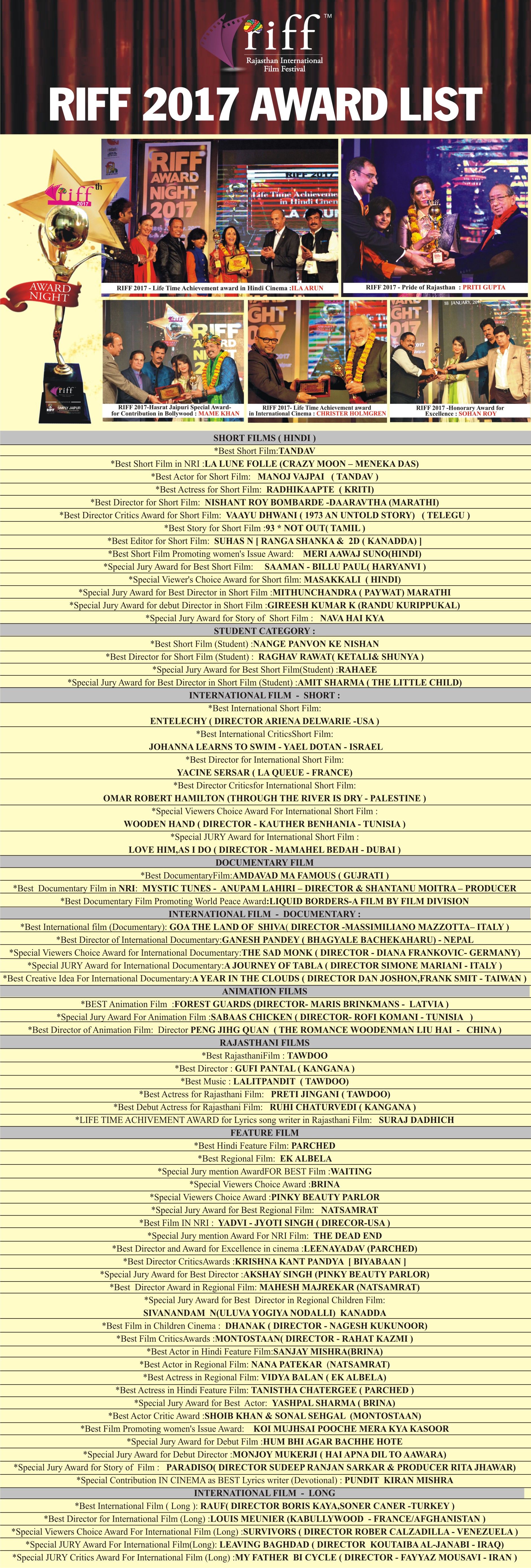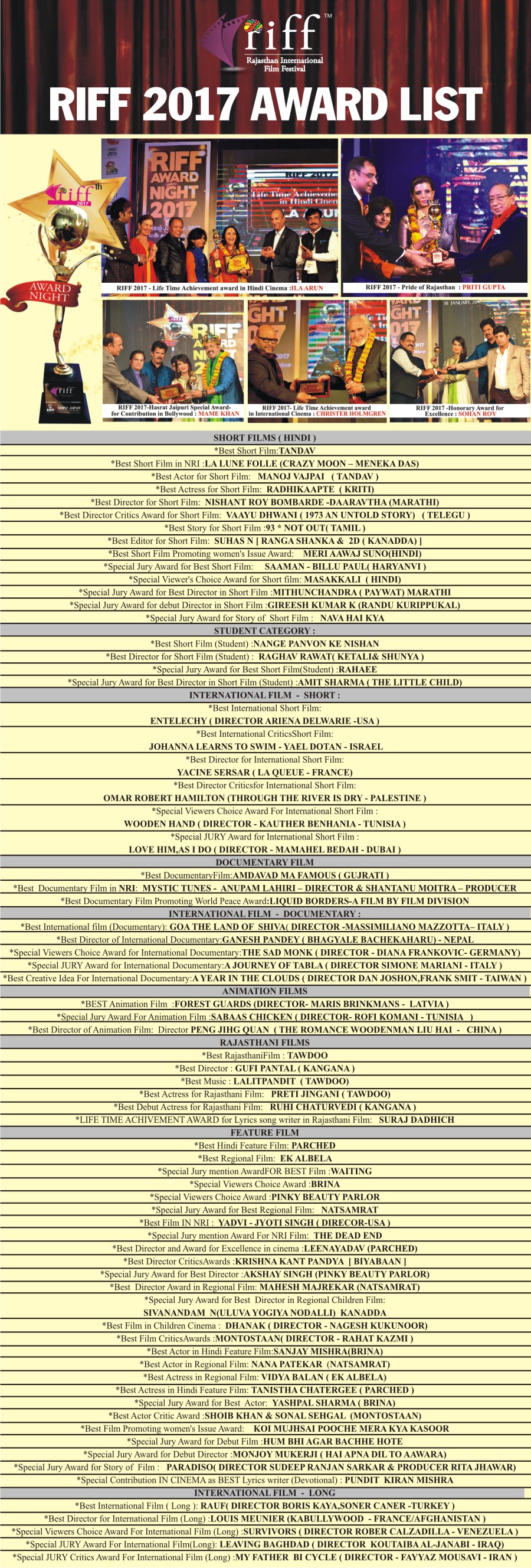 RIFF 2017 - Rajasthan International Film Festival, Jaipur is the biggest Film Festival in Rajasthan. Expected presence of more then 1000 Academic participation of youth in Internatioanl Seminar in this Five day extravaganza showcases a diverse, language independent, selection of the best feature films, documentaries and short films from around the world, include Film Bazar and Technical Sessions , Knowledge Series ( Talk Show) and RIFF Award Night including evening culture programme.