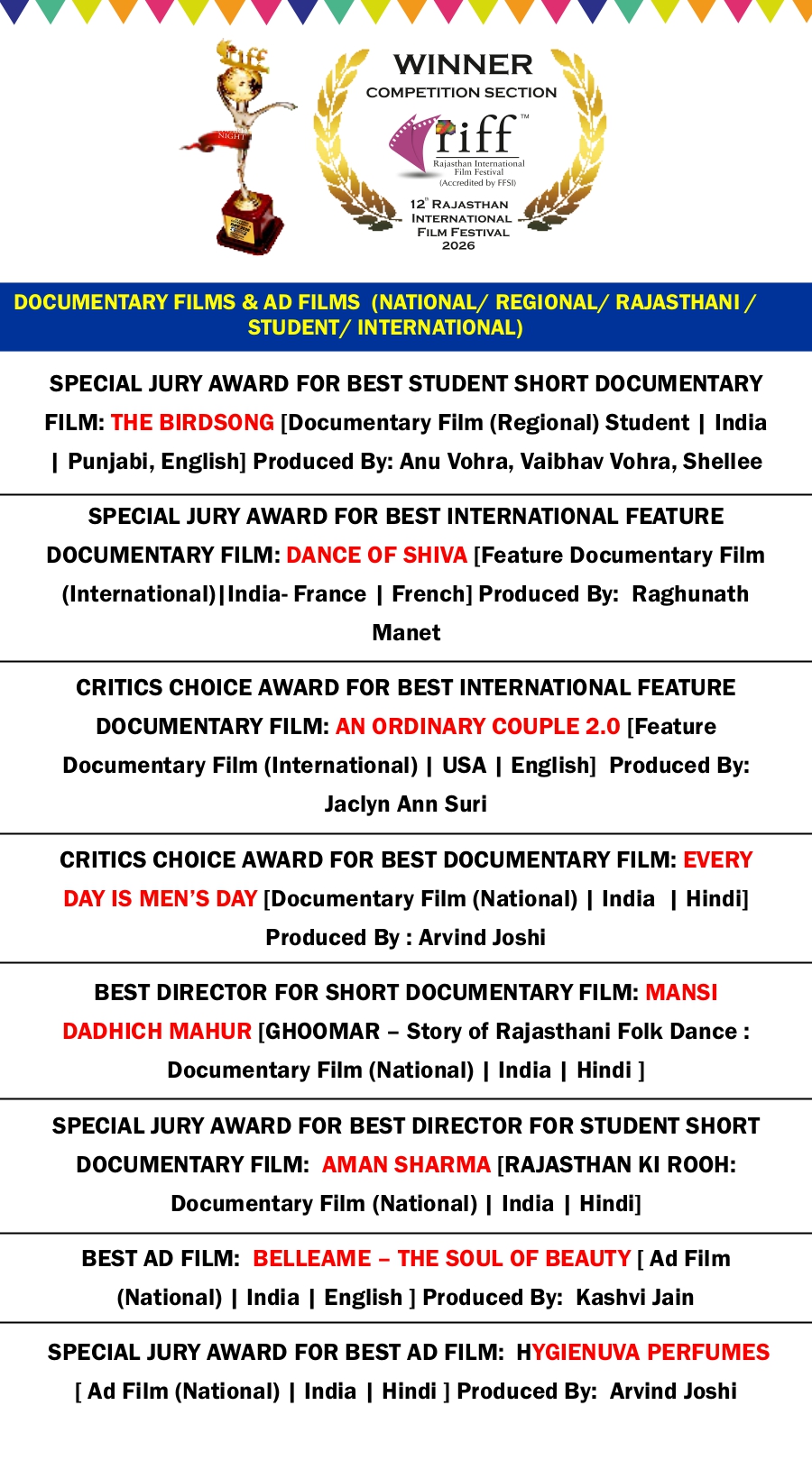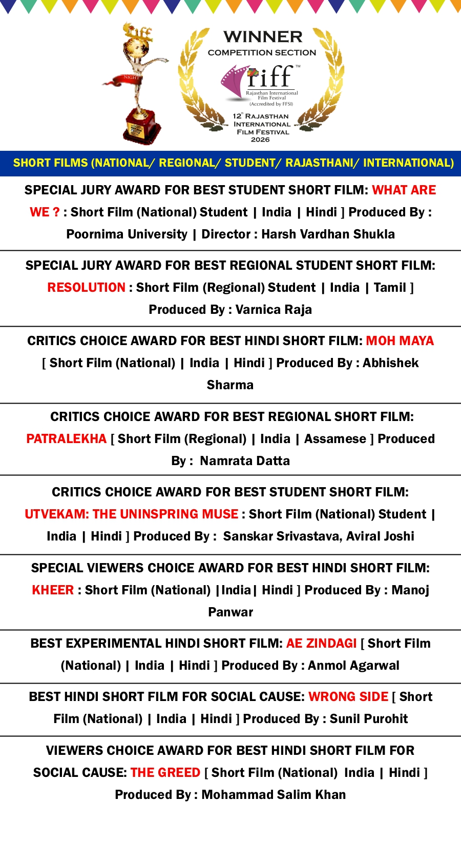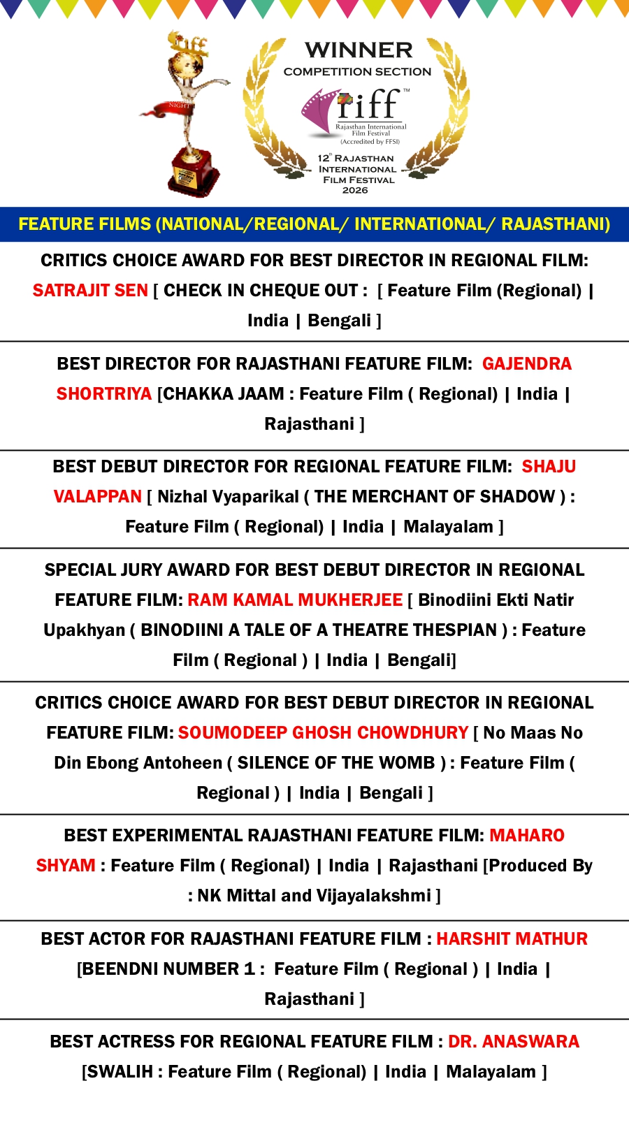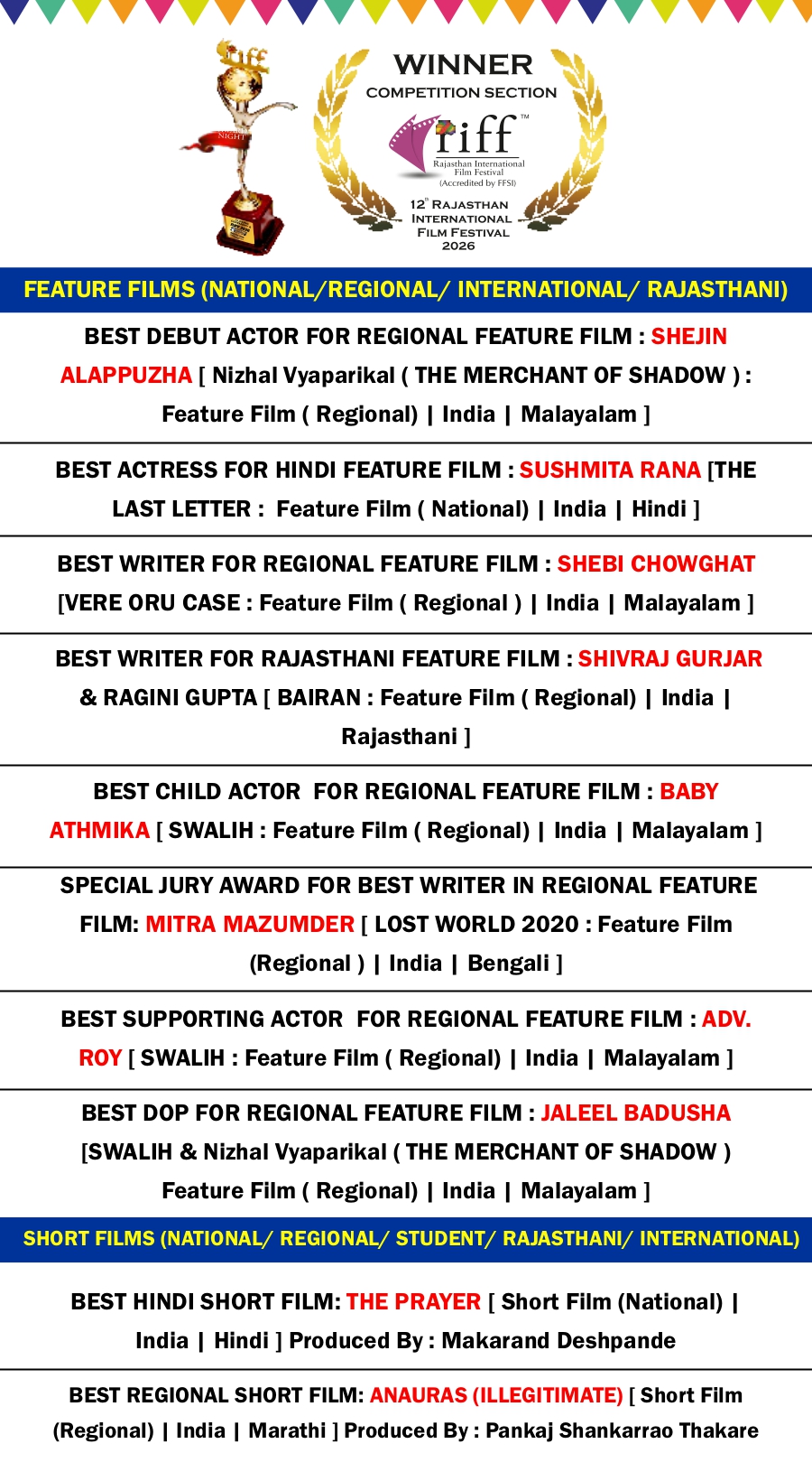 RIFF 2026 AWARD WINNER LIST on 4th FEB 2026
