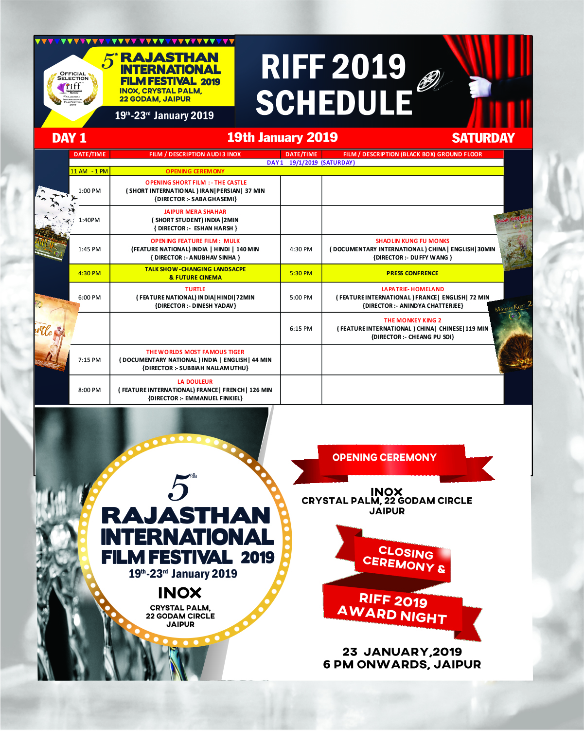 Venue : INOX Crystal Palm, 22 godam , Jaipur, Raj. INDIA