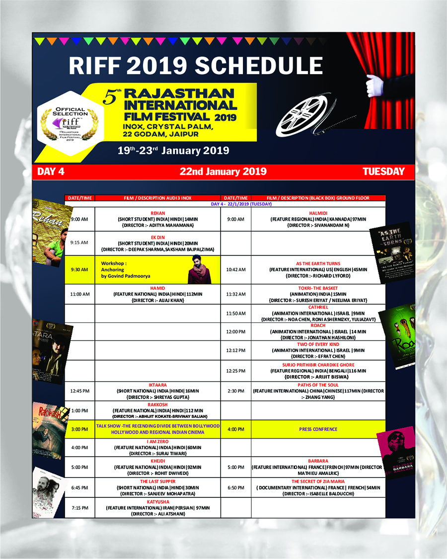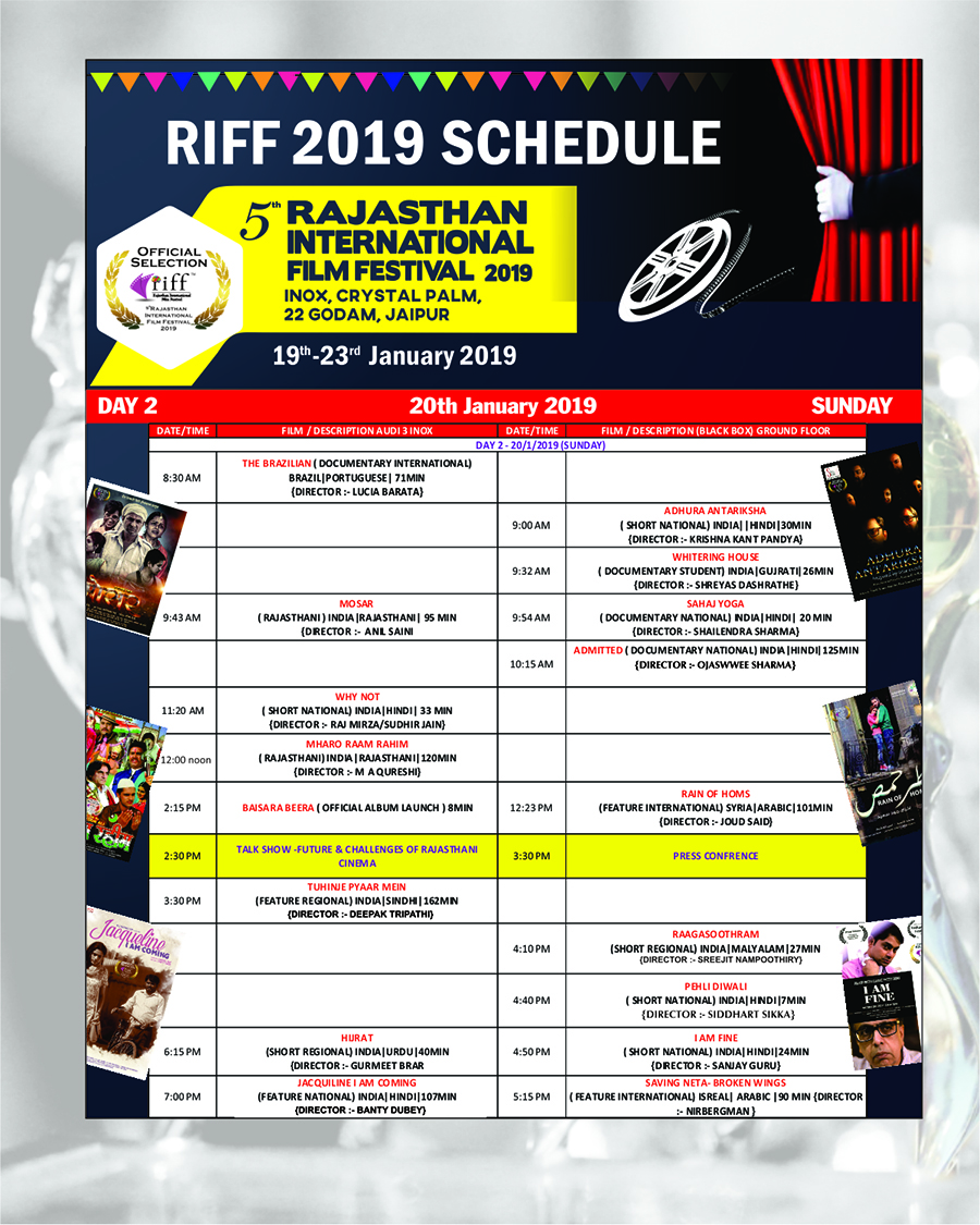 RIFF 2016 - Rajasthan International Film Festival, Jaipur is the biggest Film Festival in Rajasthan. Expected presence of more then 1000 Academic participation of youth in Internatioanl Seminar in this Four day extravaganza showcases a diverse, language independent, selection of the best feature films, documentaries and short films from around the world, include Film Bazar and Technical Sessions and RIFF Award Night including evening culture programme.
