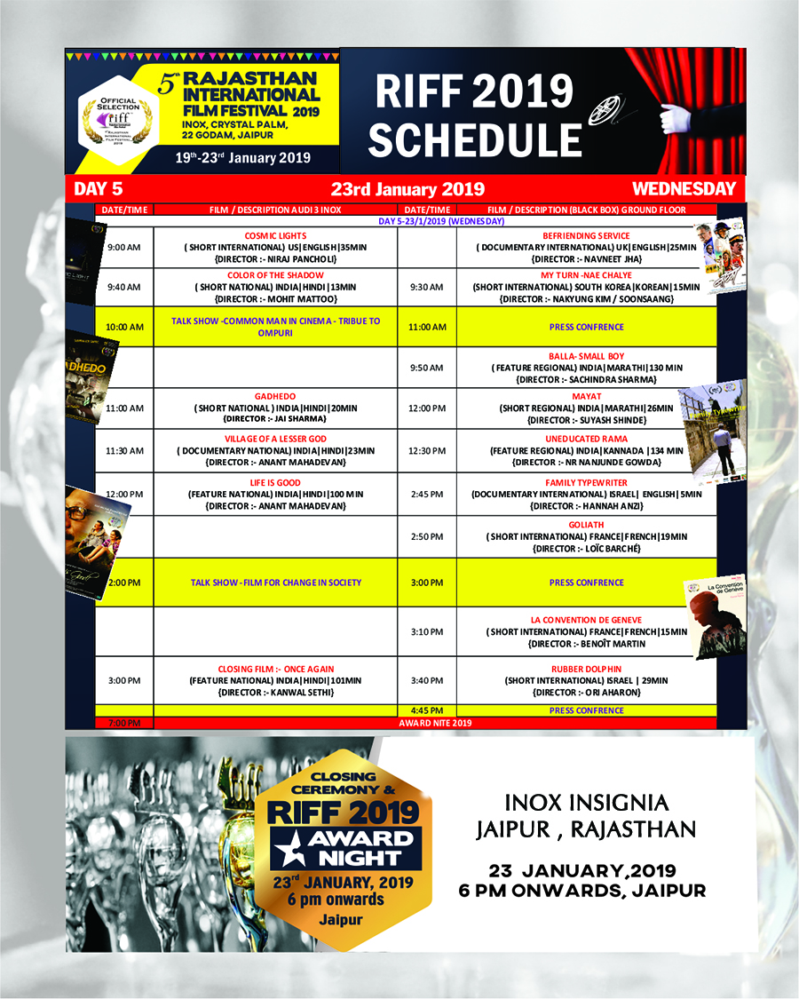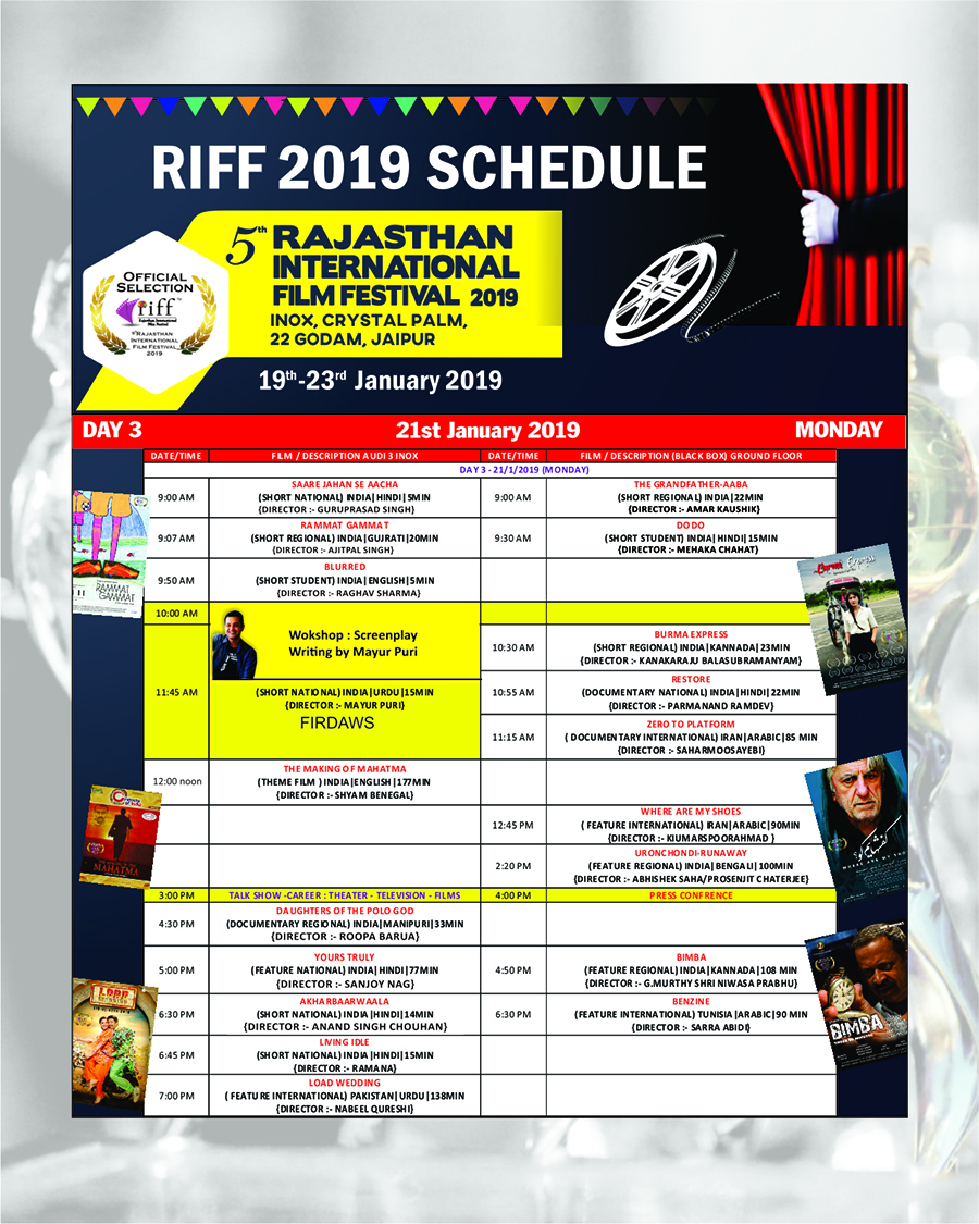 RIFF 2017 - Rajasthan International Film Festival, Jaipur is the biggest Film Festival in Rajasthan. Expected presence of more then 1000 Academic participation of youth in Internatioanl Seminar in this Five day extravaganza showcases a diverse, language independent, selection of the best feature films, documentaries and short films from around the world, include Film Bazar and Technical Sessions , Knowledge Series ( Talk Show) and RIFF Award Night including evening culture programme.
